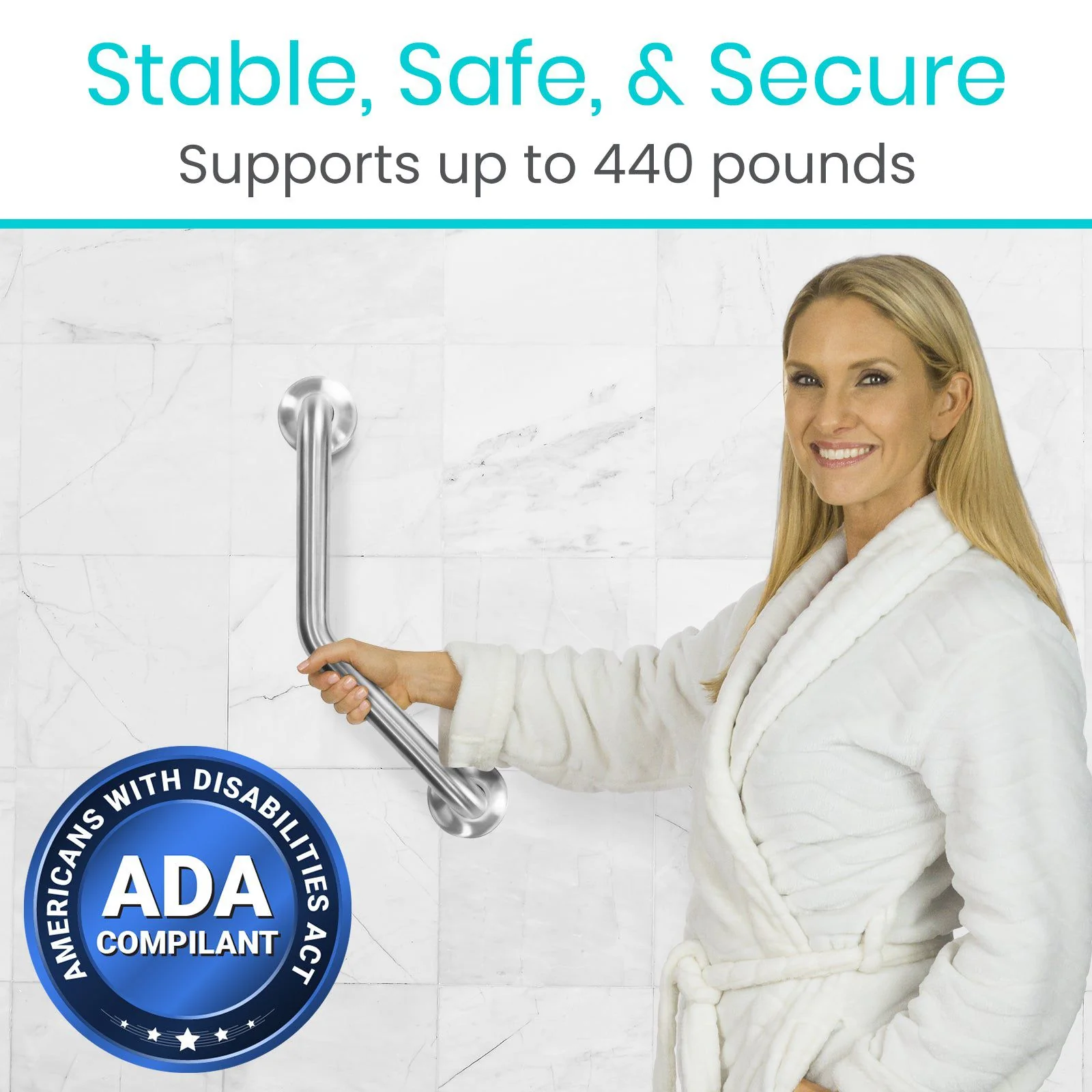 The 45-degree angled design of this grab bar provides an ergonomic grip that’s easy to hold, catering especially to individuals with limited mobility or strength. Its two 8” sections are perfectly angled to offer comfortable support, fitting snugly into your palm for added safety
