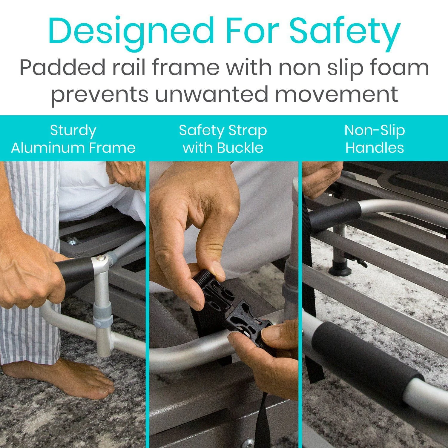 Stabilized with non-slip foam, the lightweight bed assist foot bar also features an adjustable strap to secure the foot bar to the bed frame