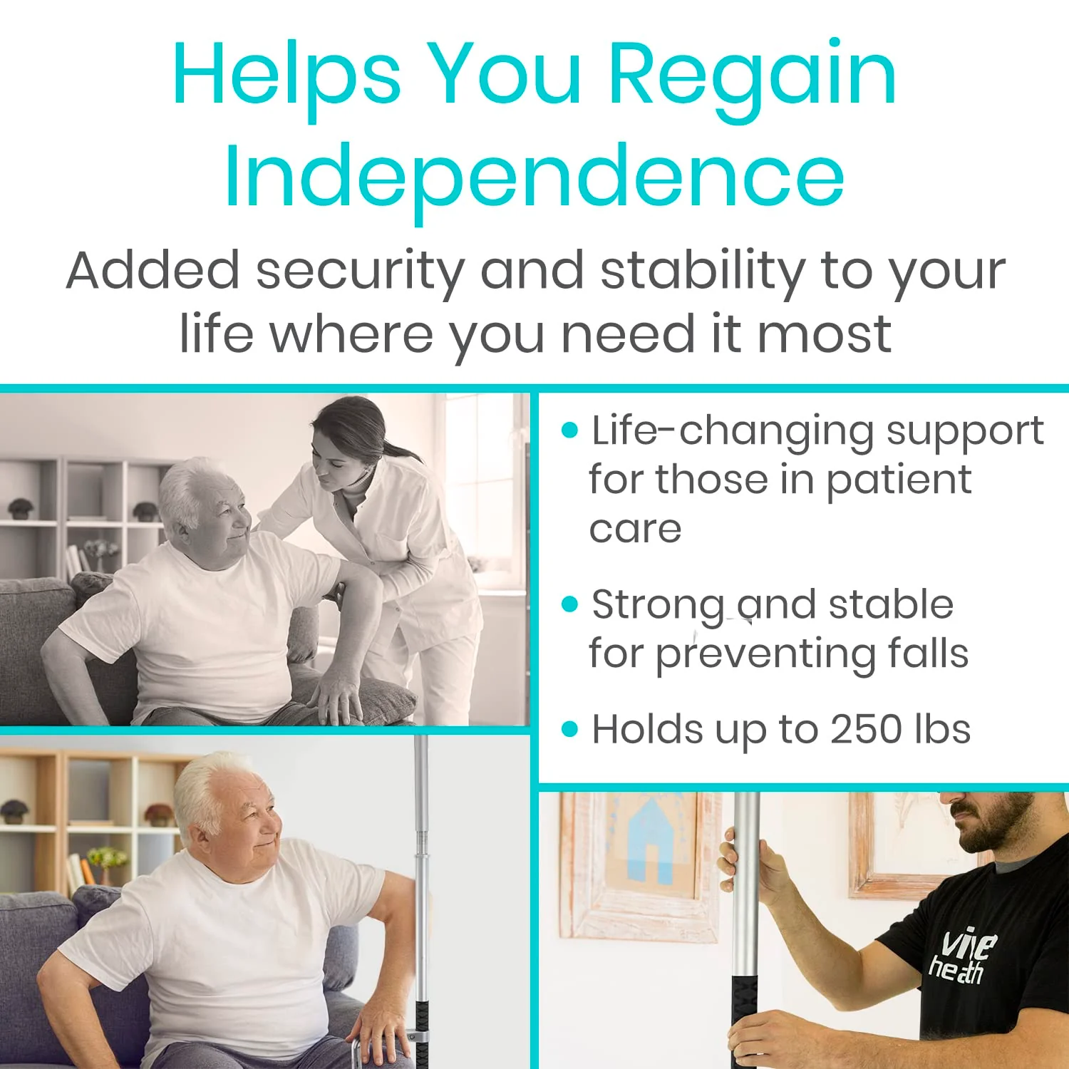 Provides stable and reliable support for standing, sitting, or trasnfering positions with a non-slip rubber grip and strong steel design.