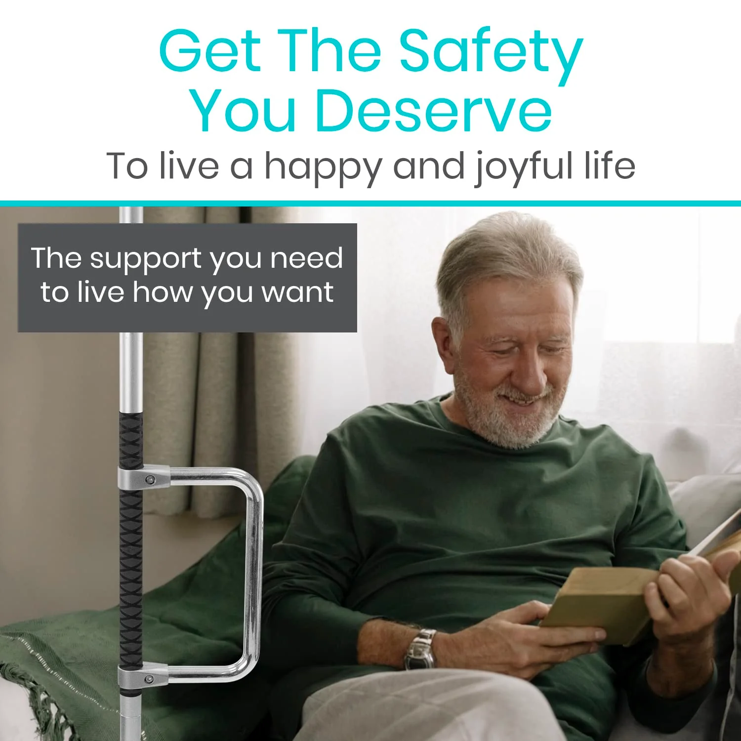Use this floor-to-ceiling grab bar to replace a bulky toilet rail, bedside support rail, and transfer board, and free up valuable space in your home.
