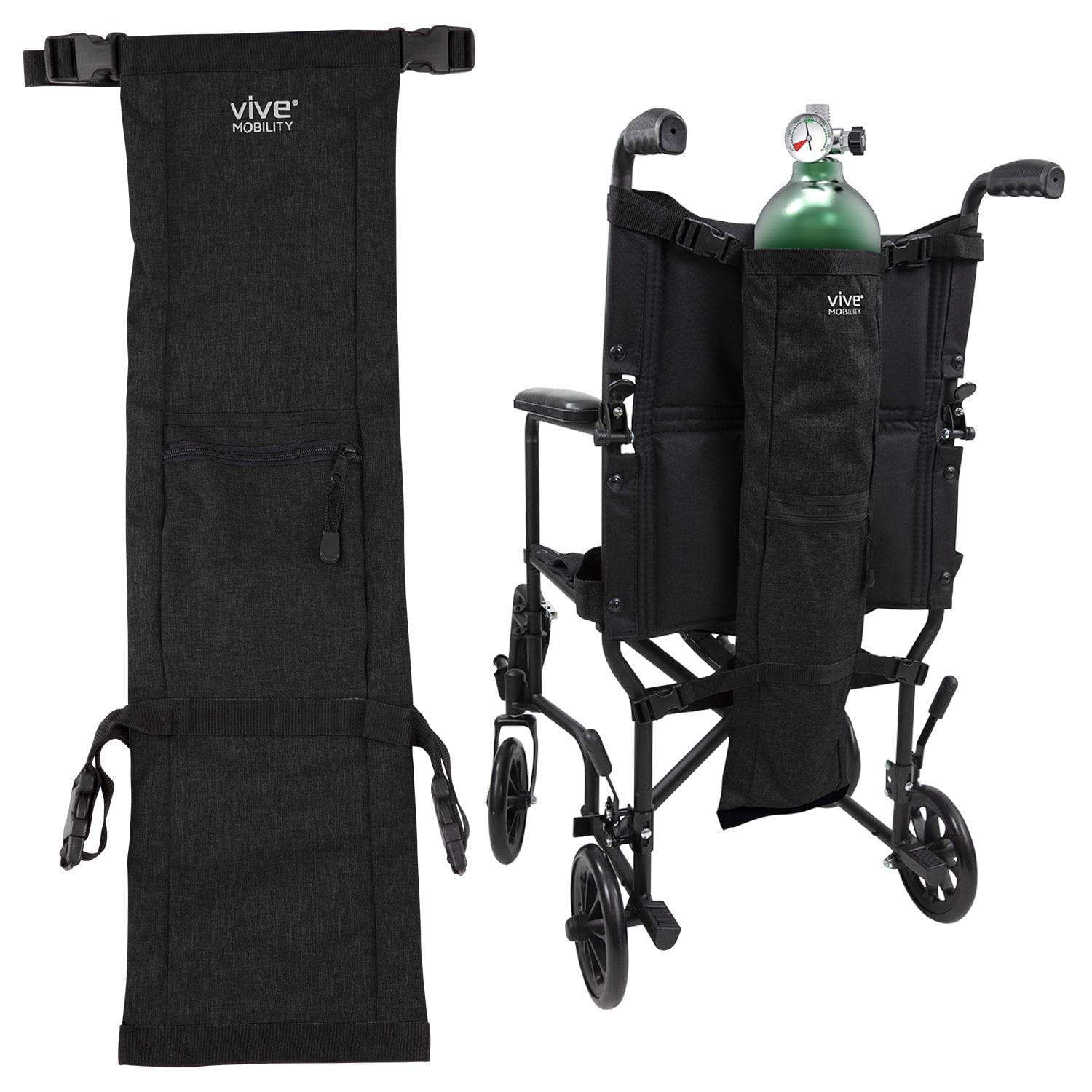 Featuring strong adjustable straps, the Vive Mobility oxygen tank holder is easy to attach to any wheelchair, transport chair, rollator or other mobility aid