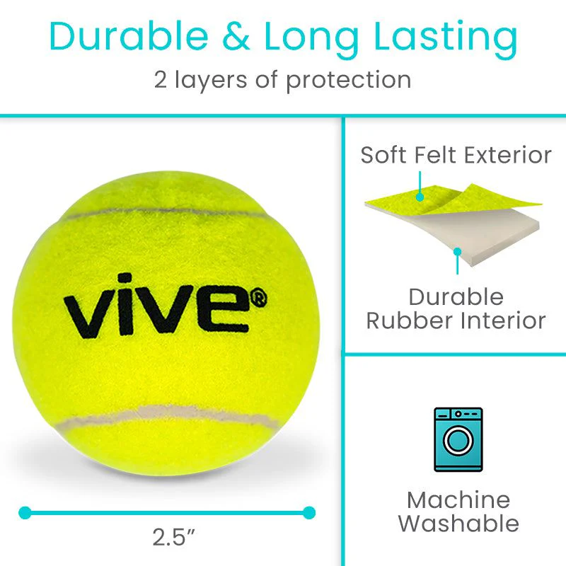 Enhance your walking experience with the Vive Tennis Ball Walker Glides, engineered for smooth and silent operation. These glides feature a durable felt exterior that glides seamlessly over indoor surfaces. The strong rubber core adds support for each step, while also ensuring quieter movement