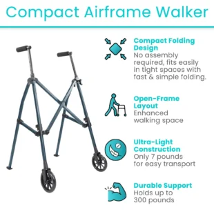 Safely supporting up to 300 pounds, the Upright Walker is constructed with durable aluminum that is lightweight for easy portability